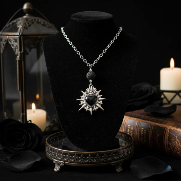 Dieses dunkle Schmuckstück verströmt einen mystischen Flair. Das, brennende schwarze Herz wurde mit einer eleganten Lavaperle kombiniert.